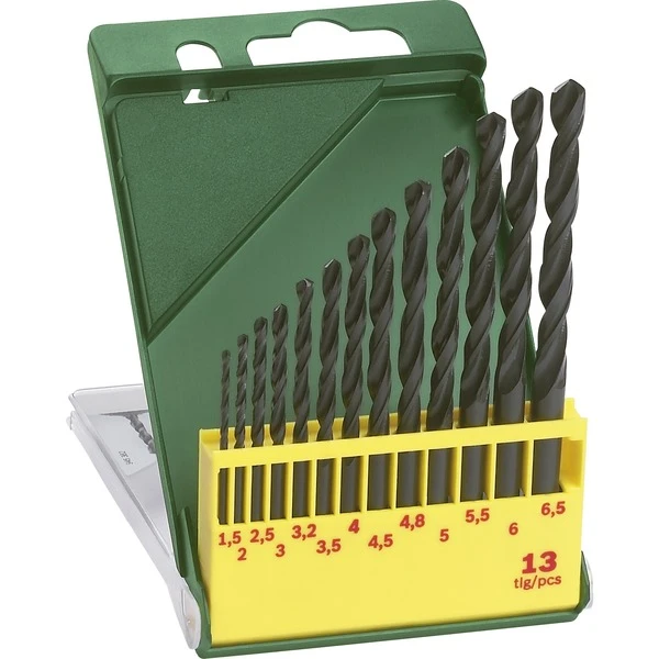 Le jeu de perceuses métalliques Bosch HSS-R 13 pièces se compose de 13 perceuses métalliques HSS-R de 1,5 à 6,5 millimètres.