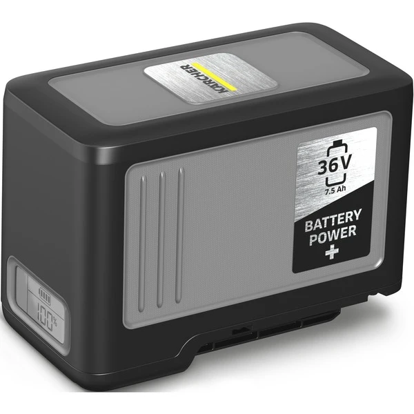 La batterie lithium-ion Kärcher Battery Power+ 36 volts d’une capacité de 7,5 Ah est protégée par un boîtier de haute qualité, très robuste, résistant aux chocs avec protection IPX5 et combine des performances maximales avec une endurance impressionnante. La batterie a été développée pour les appareils Kärcher de la plate-forme de batterie 36 volts. La batterie dispose d’une variété de mécanismes de protection: les dommages aux cellules dus à une décharge profonde, à une surtension ou à des surintensités, par exemple, sont évités de manière fiable grâce à la surveillance intégrée de la tension et à la protection contre les surintensités. La gestion efficace de la température surveille en permanence la température de la batterie et assure un équilibre thermique sûr, de sorte que la puissance maximale possible peut être fournie à tout moment. Grâce à la technologie En temps réel, le temps de fonctionnement restant, le temps de charge et le niveau de charge peuvent toujours être lus via un écran LCD.